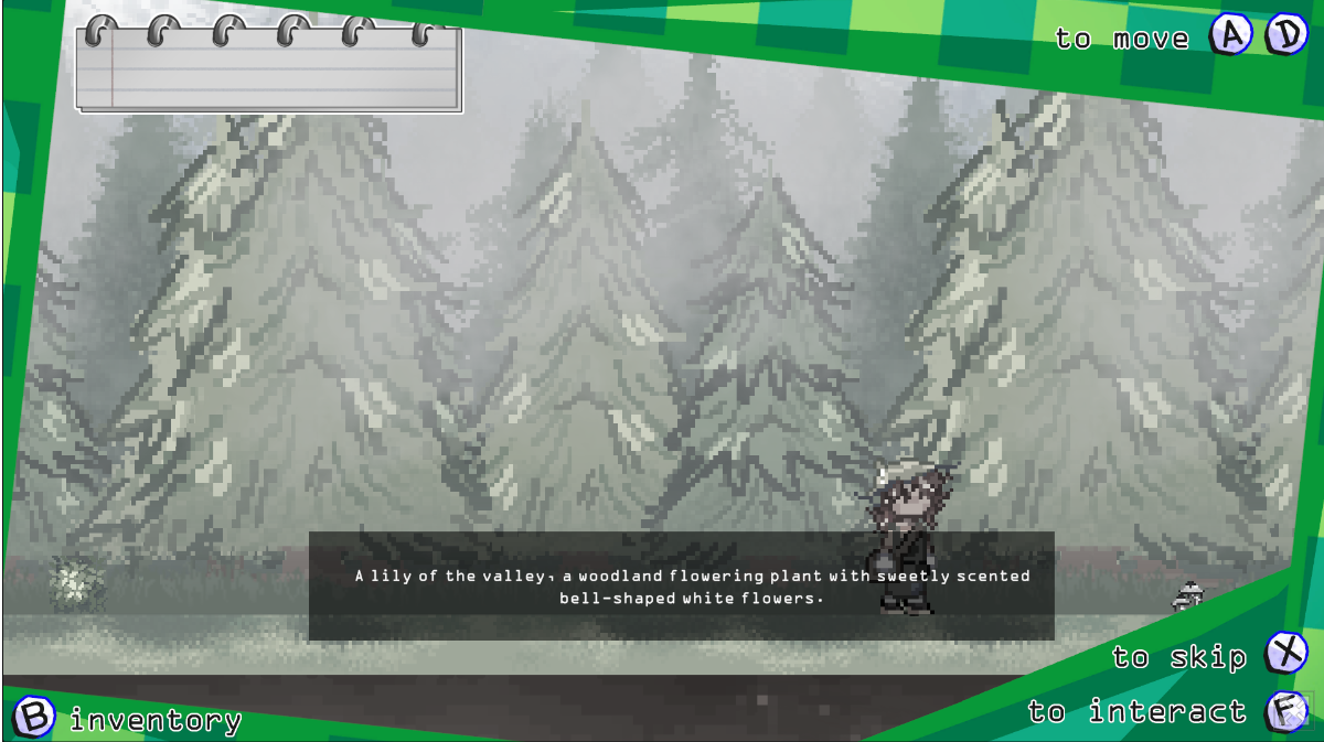 Escape your gloomy room into a black-and-white forest game you find on your computer, where your interactions with NPCs and nature gradually restore color to the world. Complete tasks, forge friendships, and collect items to brighten the environment. As the forest blooms with color, return to the real world to discover a brighter reality. This game celebrates the transformative power of nature, showing how connection and care can illuminate life. Perfect for players seeking a heartfelt, immersive experience that blends exploration, silly storytelling, and a message of hope.